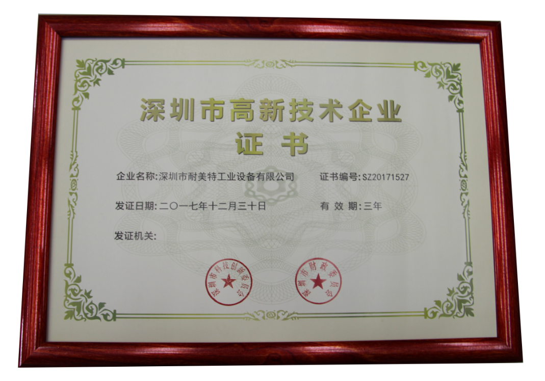 2018年伊始,深圳耐美特工業(yè)設備有限公司喜迎佳音——根據(jù)國家《高新技術企業(yè)認定管理辦法》和《高新技術企業(yè)認定管理工作指引》的相關規(guī)定,耐美特工業(yè)設備被認定為國家級高新技術企業(yè)。近日,公司也已收到了由深圳市科技創(chuàng)新委員會、深圳市財政委員會、深圳市國家稅務局、深圳市地方稅務局聯(lián)合頒發(fā)的“國家高新技術企業(yè)”認定證書,由此正式邁入國家高新技術企業(yè)行列。