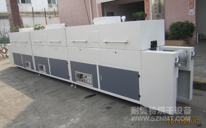 外形尺寸:總長7000*高1400*寬620mm;進(jìn)料部分長500mm,出料部分長500mm;烘干部分長6000mm,分3段,每段2000mm;